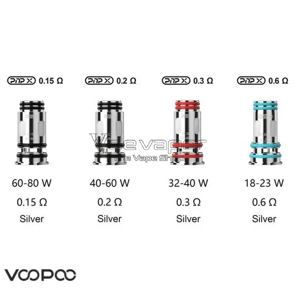 Resistencias PnP X de Voopoo modelos: 0.15 ohm, 0.2 ohm, 0.3 ohm, 0.45 ohm y 0.6 ohm compatibles con Drag S2, Drag X2, Argus Pro 2 y Voopoo Argus E40 Pod Kit hasta el momento.